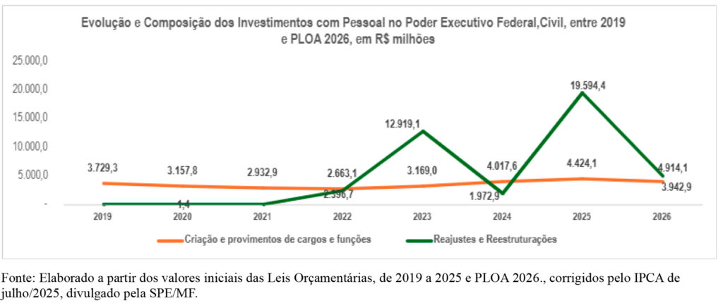 Impulsionada por decisões governamentais de recomposição e fortalecimento da máquina pública, os investimentos com pessoal passaram a ser considerados um aporte estratégico para a produção de eficácia das políticas públicas e para a própria modernização da administração federal. No período considerado, entre 2019 e 2022, nota-se um comportamento praticamente vegetativo dos dois grandes agrupamentos considerados, mas entre 2023 e 2026 há variações positivas mais significativas, sobretudo no segundo grupo de despesas, devido à reativação governamental no campo dos reajustes salariais e reestruturações de carreiras.