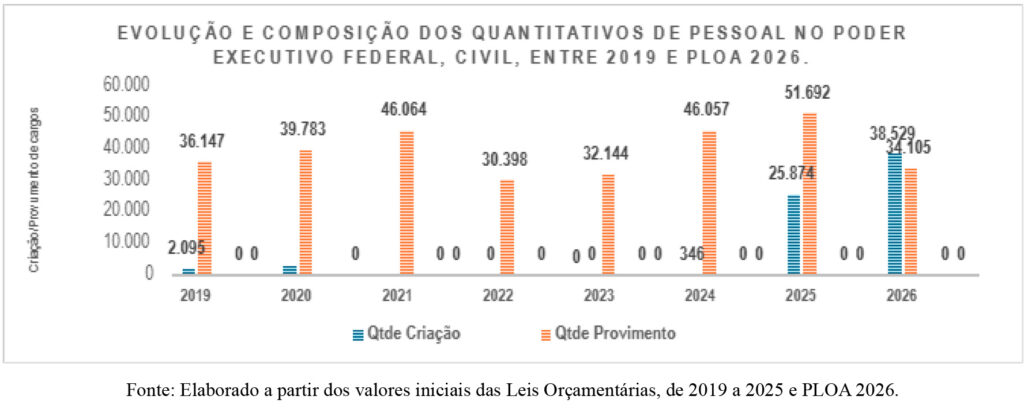 Conforme apontam as informações do gráfico 1, nota-se, de saída, uma modificação significativa nos dados entre 2019 e 2026, para os dois grandes agrupamentos considerados, a saber: i) criação e provimentos de cargos efetivos civis e ii) reestruturações de carreiras e reajustes de remuneração. Importante entender que o primeiro agrupamento se refere a investimentos em expansão de pessoal, que se refletem em despesas relacionadas à contratação de novos servidores para a APF. O segundo grupo, por sua vez, foca na valorização do servidor, vale dizer, gastos com reajustes salariais e reestruturações de carreiras, que visam atualizar e melhorar as condições de vida dos servidores ativos, aposentados e pensionistas.