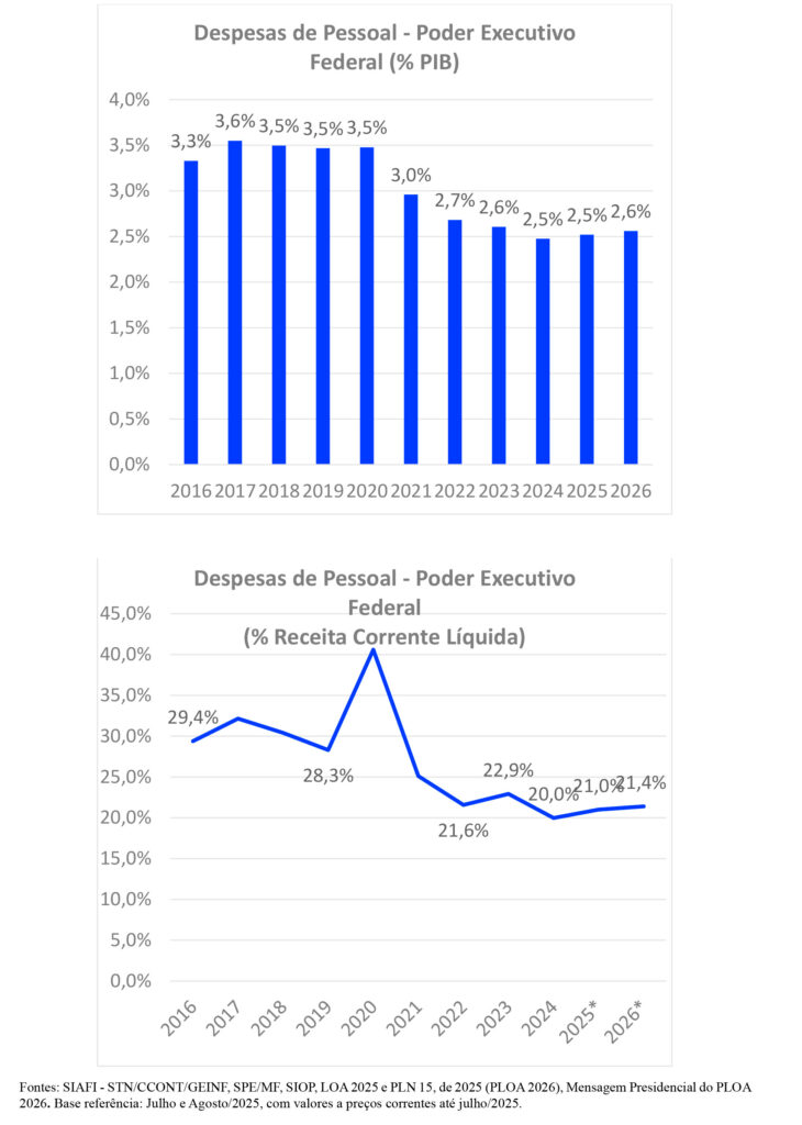 Em relação ao Produto Interno Bruto (PIB), bem como relativamente à Receita Corrente Líquida (RCL), os investimentos com pessoal civil ativo da APF terão declinado, respectivamente, da casa dos 3,5% do PIB e 40% da RCL, em 2020, para algo como 2,6% do PIB e 21% da RCL, em 2026. A razão para tanto está ligada ao crescimento mais que proporcional do produto interno bruto e, consequentemente, da receita corrente líquida, relativamente ao crescimento dos investimentos com servidores públicos federais da União.